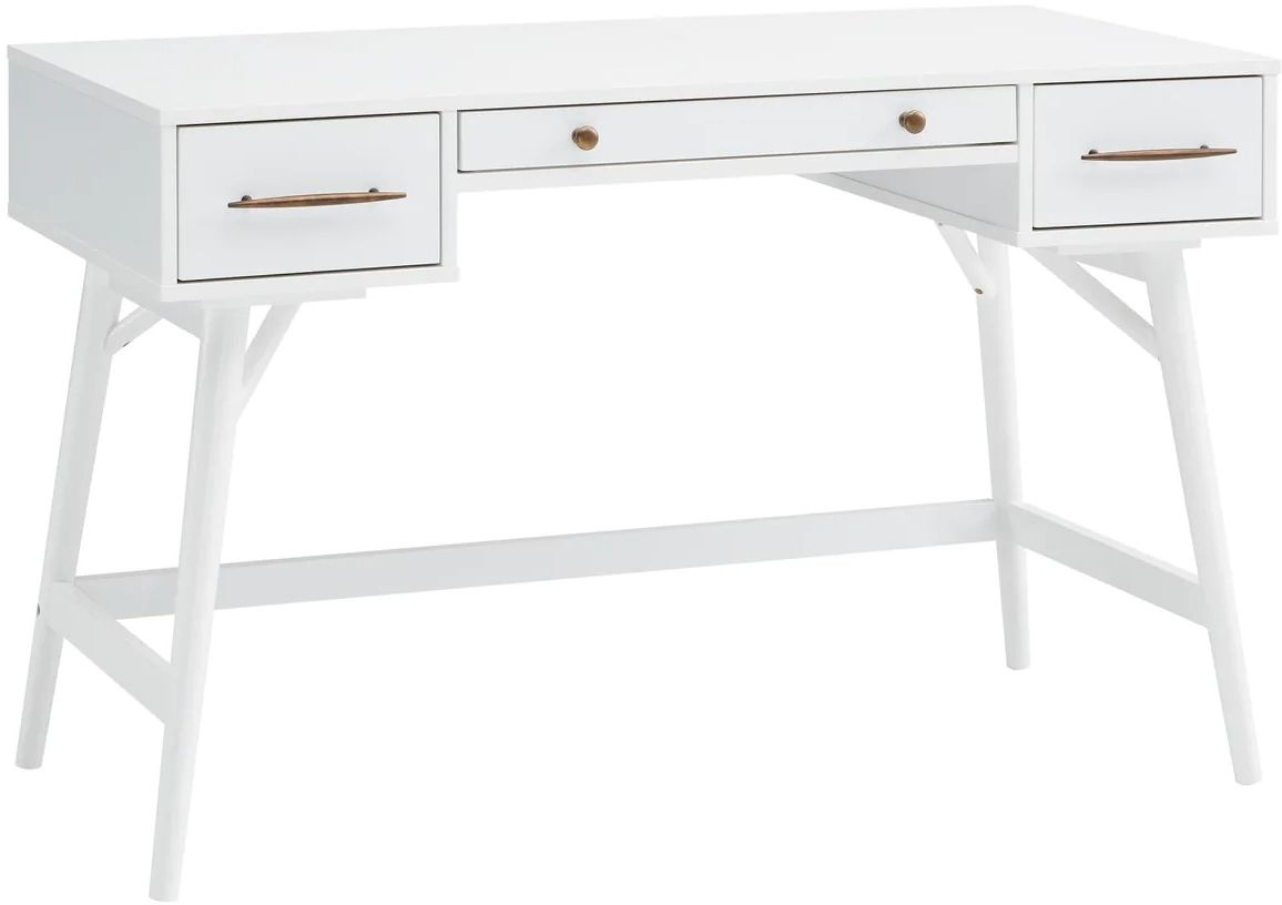 Enjoy a bright white finish with brass hardware, and three storage drawers that offer room for stashing away essentials. Telltale slant legs reinforce a retro theme, playing up the boxy top desk unit. Make a simple space a haven for mid-century charm.