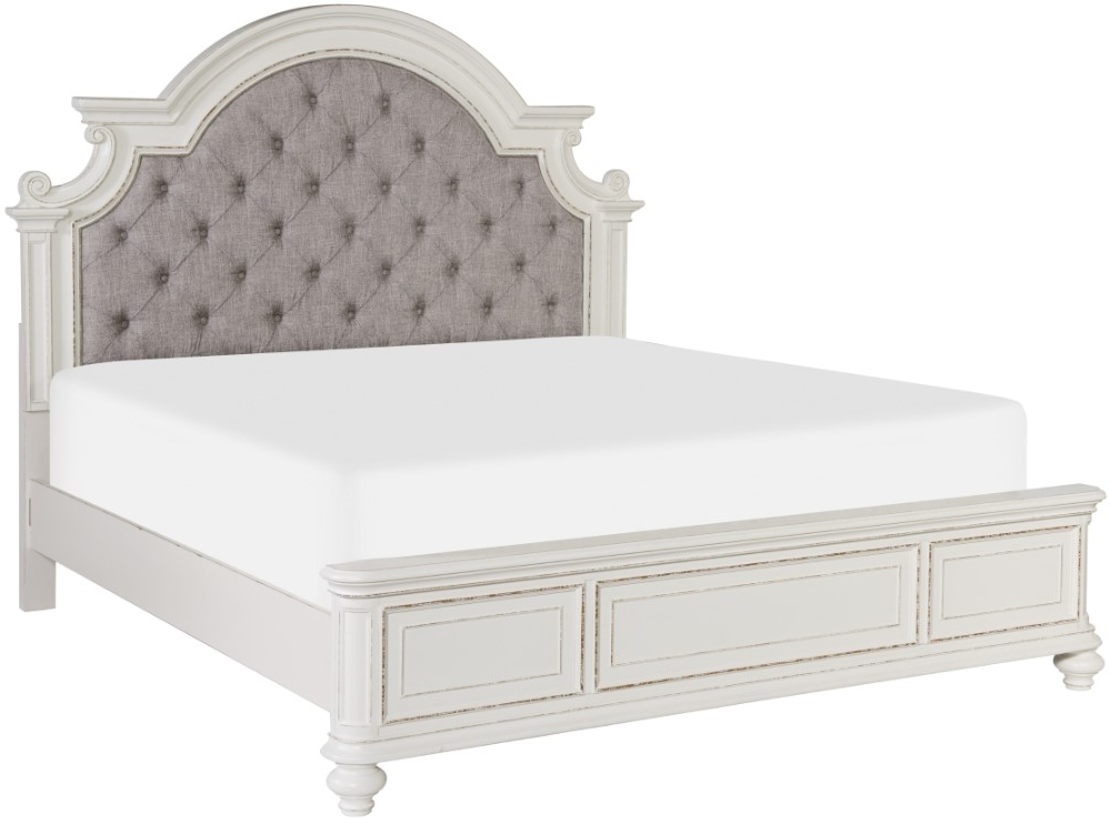 Soft, sweeping curves define the elegant profile of the Baylesford Collection. The Eastern King bed is softened by an antique white rub-through finish creating a romantic aesthetic will place beautifully within your bedroom. Dark gray pleated, button-tufted fabric provides stunning contrast to the look of the bed.Read More