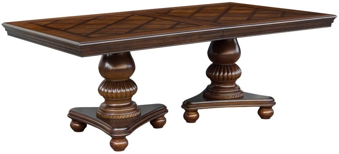 Elegantly designed for the traditional dining room is the Lordsburg Collection. Supported by the double pedestal base is the tabletop where the magnificent parquet veneer is highlighted by the brown cherry finish. Heavily carved molding provides distinct accent to the tabletop.Read More