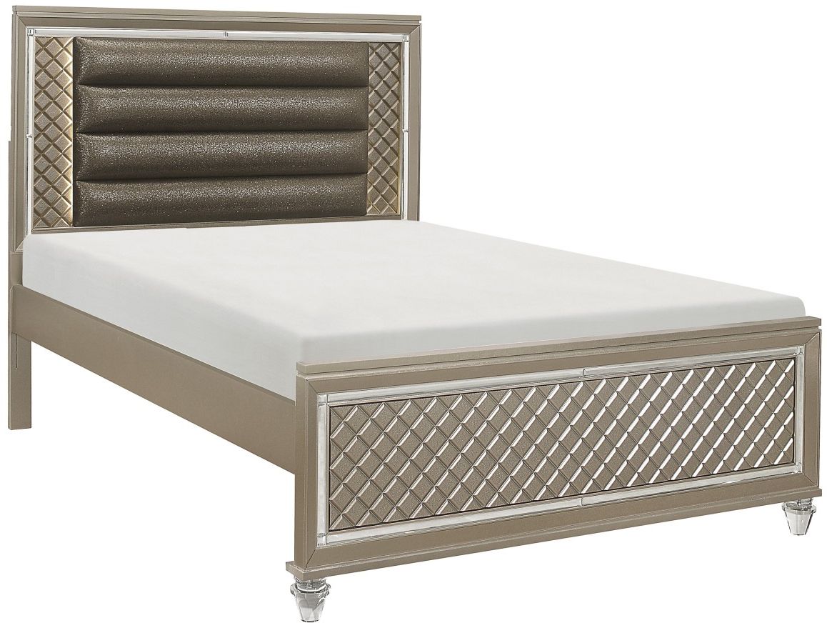 The glamour girl in your life will love the addition of the Loudon Collection to her bedroom. The champagne finish of the full platform bed shimmers with LED backlighting the headboard while additional sparkle comes in the form of the embossed diamond pattern accent, mirrored framing, and acrylic feet.Read More