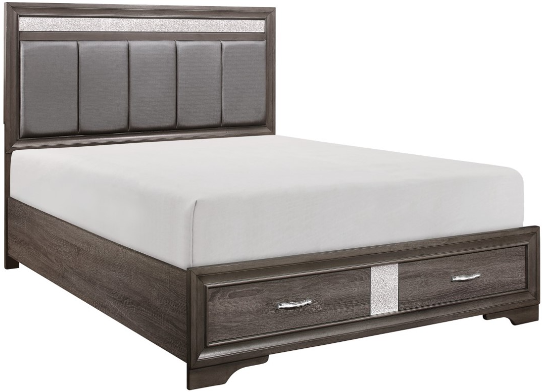The unique styling of the Luster Collection presents a glamorous option for your bedroom. The embossed faux-wood veneer features a gray finish that allows for the decorative accents of the California King bed to shine. The panel headboard features acrylic silver glitter accent banding as well as a gray faux leather channel-padded insert.Read More