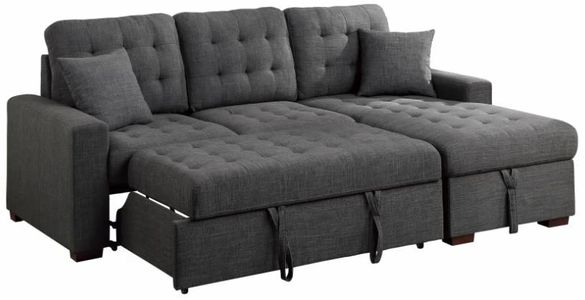 Conveniently stored beneath the right-side two-seat unit is a pull-out trundle that rises to create a bed while the top of the attached left-side chaise opens to reveal under-seat storage.