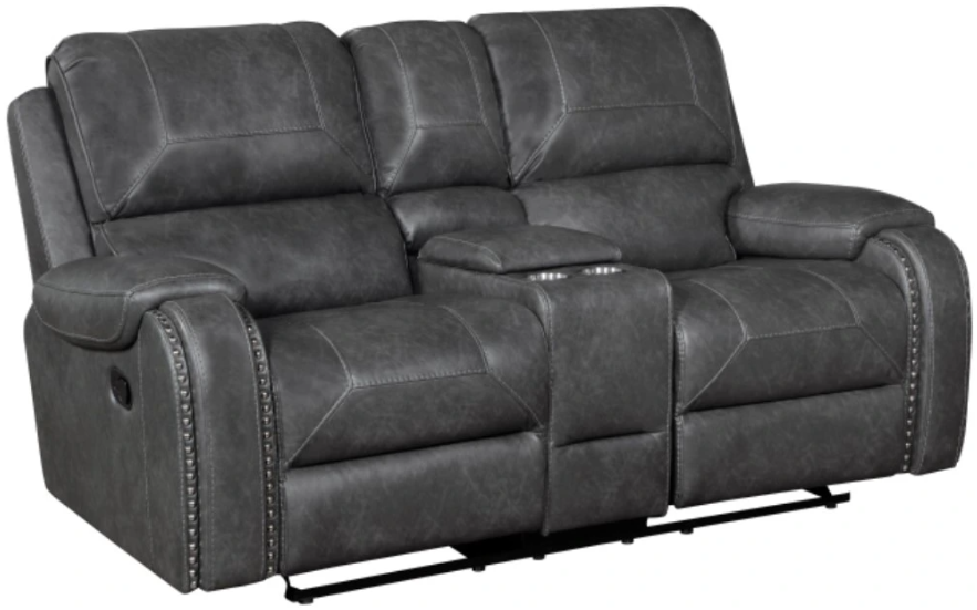 Pairing traditional nailhead accent with a transitional profile creates the look of the Newnan Collection. The dual glider love seat -with center console features manual reclining mechanisms allowing for ease of motion when going from seated to reclined.Read More