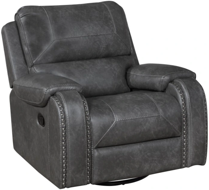 Pairing traditional nailhead accent with a transitional profile creates the look of the Newnan Collection. The chair features a 360-degree swivel base and manual reclining motion mechanism. Gray breathable faux leather upholstery covers the chair and is a neutral complement to your home’s décor.Read More