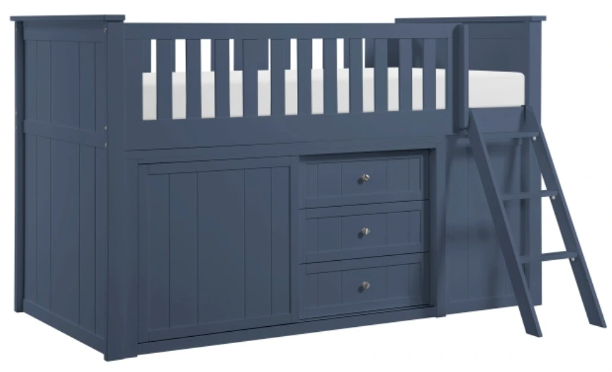 Maximize your floor space with this versatile blue low loft bunk, an all-in-one sleep and storage solution designed for modern bedrooms. Crafted from durable wood and UV-finished veneer, this bed features a built-in bookcase and a 3-drawer dresser to keep essentials organized.Read More