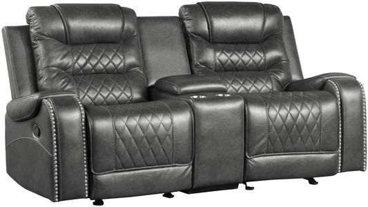 The love seat’s center console features cupholders and power receptacles. The Putnam Collection is offered in gray breathable faux leather upholstery with diamond pattern stitching with nailhead-adorned arms for classic decorative effect.