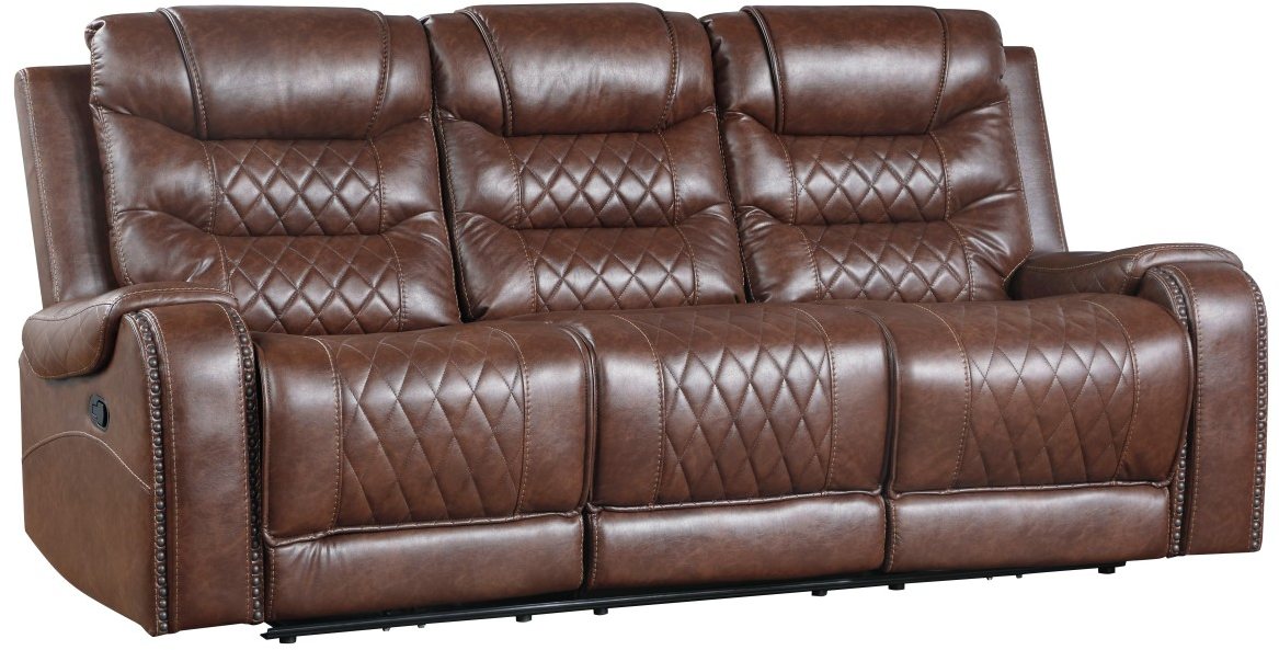 The Putnam Collection is offered in brown breathable faux leather upholstery with diamond pattern stitching with nailhead-adorned arms for classic decorative effect.