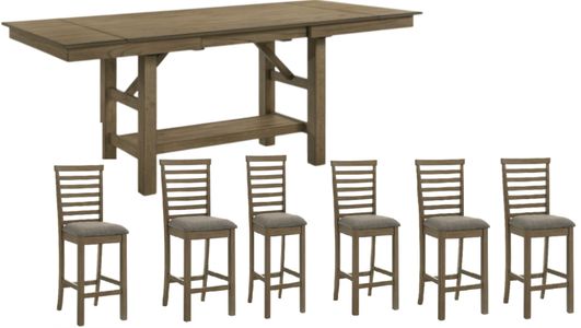 Set includes gathering table and 6 slat back upholstered counter chairs