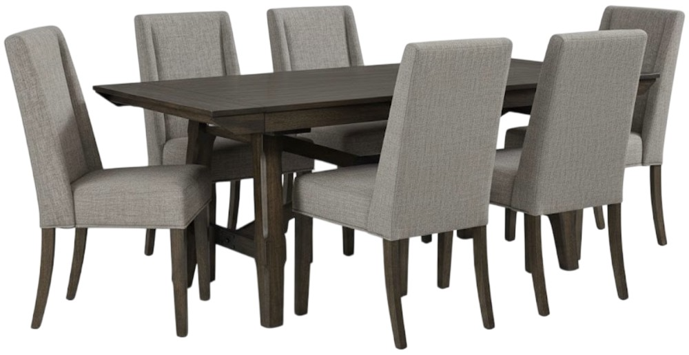 Gather the family around the Double Bridge optional 7-piece trestle table set. This kit features a dark chestnut finish with wire brushing. The table offers two 12-inch leaves, one for each end of the table, to accommodate guests or a larger family, and an easy glide track system for added convenience.Read More