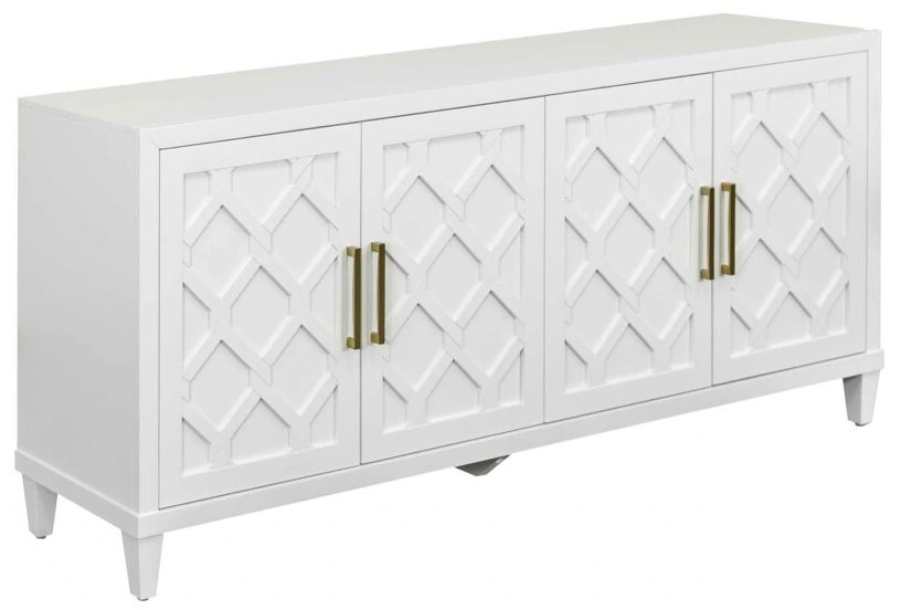 Fresh white finish and raised pattern on the doors resembling an intricate garden trellis, accented with brushed gold handles.