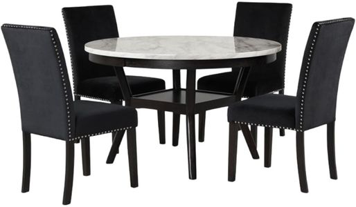 If you prefer counter height, choose from a 42” round table, 42” square table or a 3 person theater bar counter table. These chic tables feature a glossy finish on the tabletop that provides both heat and water resistance, ensuring easy cleaning and protection from wear. The white and gray veined faux marble top, complemented by deep espresso legs, creates a contemporary and glamorous ambiance. Crafted from solid Rubberwood and high-quality manufactured wood components, the Celeste dining collection is designed for longevity. Accenting the table, luxurious seating awaits with the soft and durable 100% polyester velvet fabric covering sumptuous memory foam cushion. Available in black, royal blue and gray, the chairs are tailored for elegance, the rich and luxurious colors of the velvet chairs enhanced by silver nailhead trim, providing a sparkling final touch to this impeccable dining collection. Elevate your dining experience with Celeste—a fusion of contemporary glamour and enduring quality.