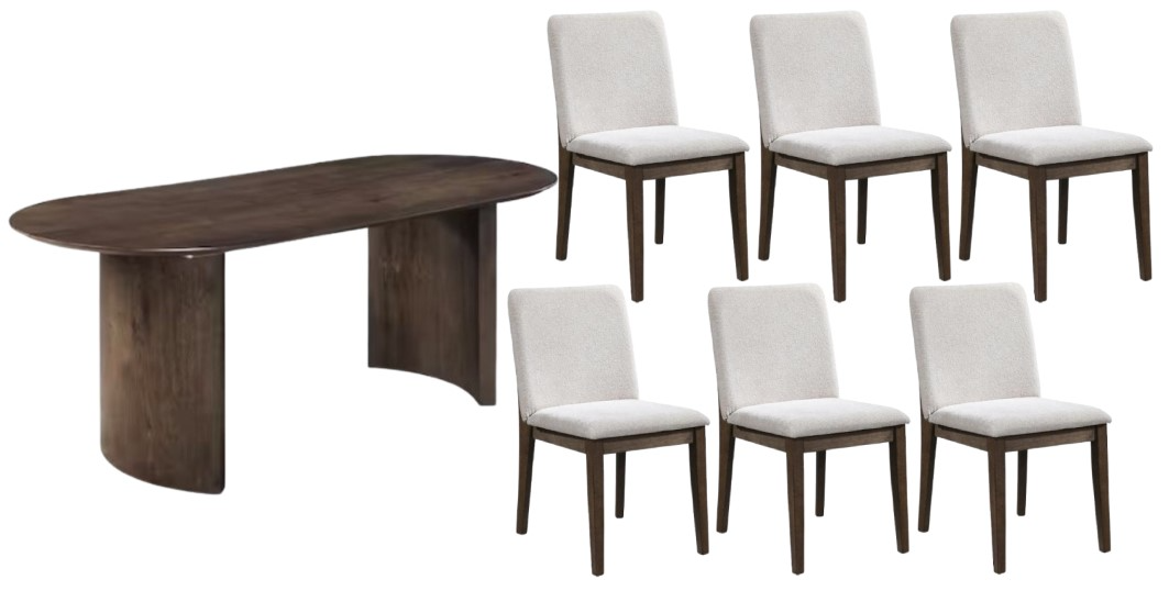 The collection includes oval and rectangular tables with sleek lines and seating for six. Upholstered chairs in cream, forest green, or gray feature plush, easy-care fabric and peek-a-boo backs, bringing comfort, function, and style.