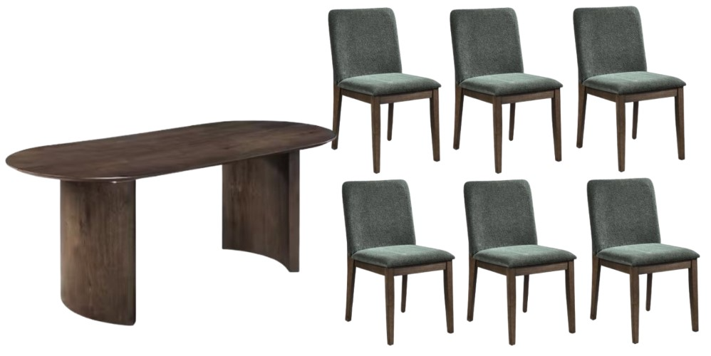 The collection includes oval and rectangular tables with sleek lines and seating for six. Upholstered chairs in cream, forest green, or gray feature plush, easy-care fabric and peek-a-boo backs, bringing comfort, function, and style.