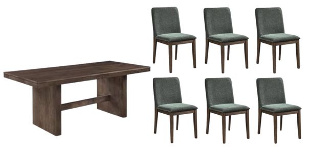 The collection includes oval and rectangular tables with sleek lines and seating for six. Upholstered chairs in cream, forest green, or gray feature plush, easy-care fabric and peek-a-boo backs, bringing comfort, function, and style.