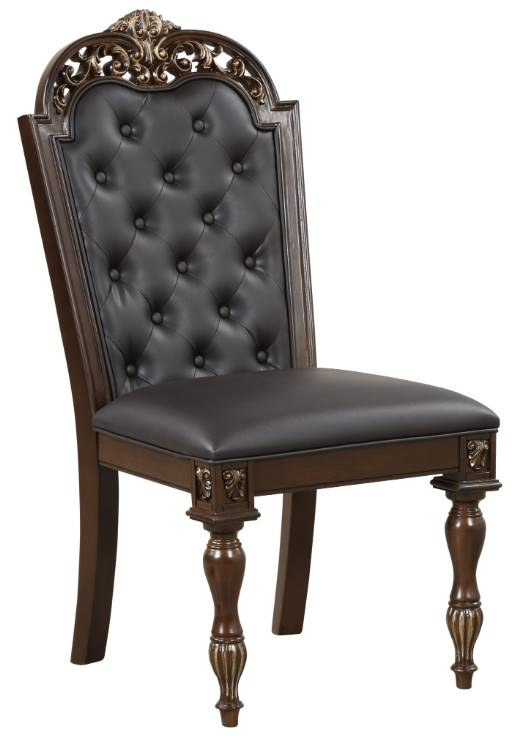 Sumptuous chocolate brown vegan leather adorns the button-tufted backs and cushions, providing an elegant and regal look while offering supportive, comfortable seating for a luxurious dining experience