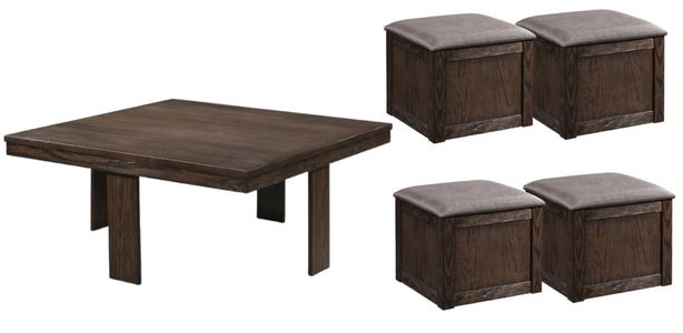 The Paxton occasional table with storage stools combines style and function in one versatile design. Crafted of solid pine with mindy veneers, the table features a rich dark brown finish that highlights natural wood grain. Four upholstered stools slide neatly under the table when not in use, each with hidden storage to keep blankets, games, or essentials organized.Read More