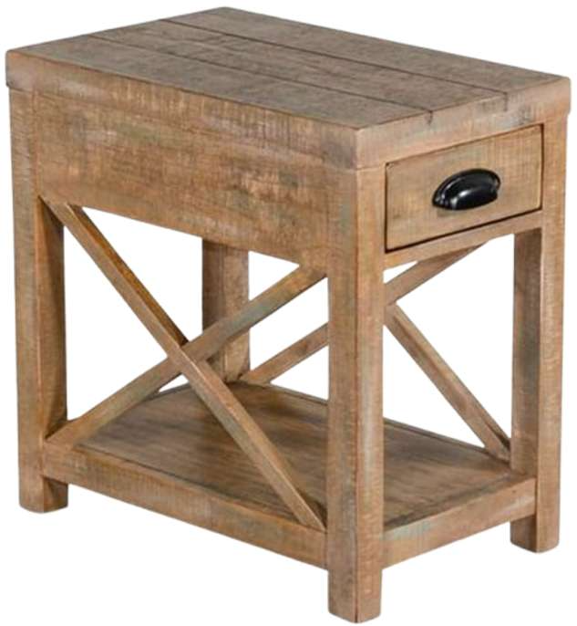 The Durango collection offers a beautiful chair side table finished in a weathered brown finish. It features drawer storage throughout, hidden casters for easy movement, bottom shelf for storage throughout and each table features a decorative X motif on the side panels.